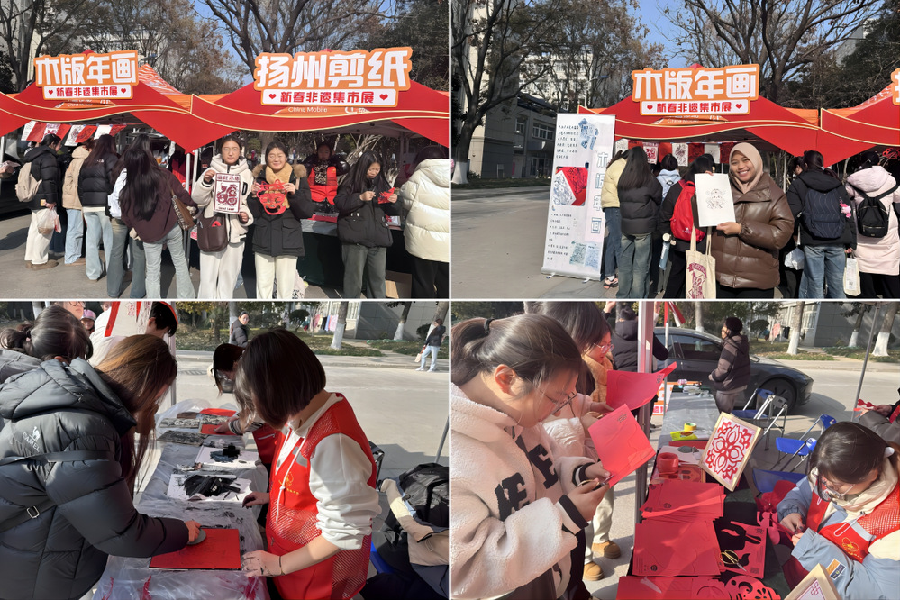 以木板为纸,以刻刀为笔,学子们通过专业学习,精心雕琢出一幅幅充满新春祝福的木版年画。刷墨、铺纸、拓印……在红烛精神志愿服务队志愿者们的悉心指导下,师生们亲自体验年画印制工艺,一幅幅栩栩如生的年画轮廓便跃然纸上,展现出特色非遗手工艺的创造力,也表达了对新春的祝福和憧憬。“很开心能体验拓印木版年画、剪窗花这些极具有扬州特色的民俗文化,提前感受到了中国春节的喜庆氛围。”来自印度尼西亚的留学生刘丽娜说。