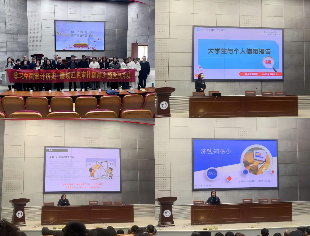 扬州农村商业银行机关第一党支部赵丁璐、陈智娟、姜明明,分别以“防范于心 反诈于行”“洗钱知多少”“大学生与个人信用报告”为主题,通过情景化演绎、案例解析与现场互动答疑,为师生们上了一堂生动的金融防诈安全课,呼吁大学生们要树立正确金钱观,警惕“高薪兼职”“快速致富”的诱惑,切勿成为犯罪分子的帮凶。校审计处党支部黄茜璐老师为学生上了一堂“学习中国审计历史 赓续红色审计精神”党课。